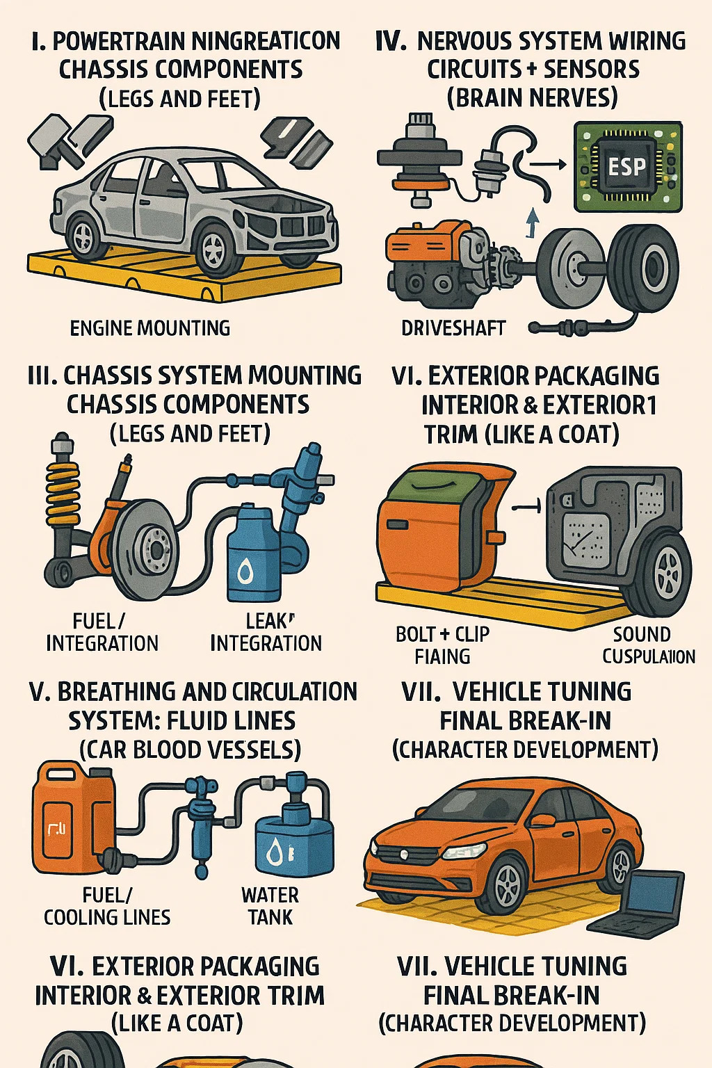 Linii de combustibil/răcire: rezervorul de combustibil → pompa de combustibil → injectoarele de combustibil formează un „canal de alimentare cu combustibil”, în timp ce rezervorul de apă → pompa de apă → blocul motor formează un „ceai de răcire”.
