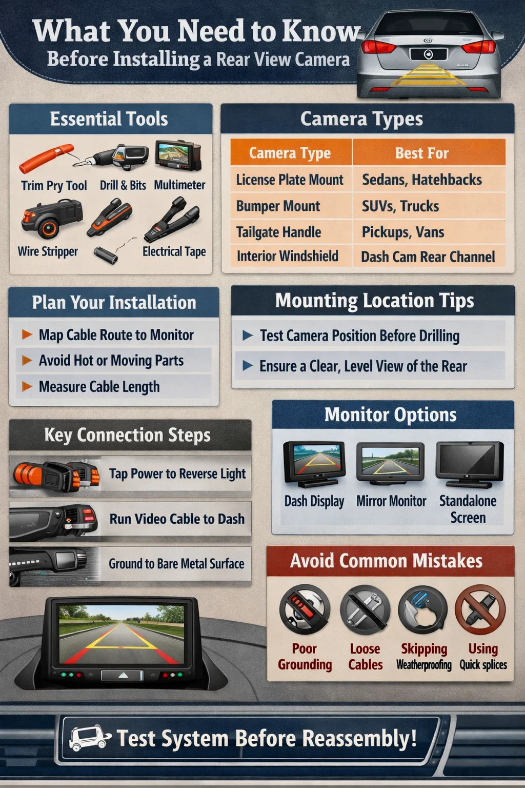 O cameră video din spate este una dintre cele mai practice piese de automobile legate de siguranță pe care le puteți adăuga oricărui vehicul. Când este instalat corect, utilizând pașii descriși în acest ghid, oferă ani de service fiabil, elimină riscul de a reveni în spate în obstacole pe care nu le puteți vedea și poate fi un factor decisiv în evitarea accidentelor cu viteză redusă în parcări - situații care reprezintă aproximativ 20% din toate coliziunile vehiculelor raportate anual pe piețele majore.