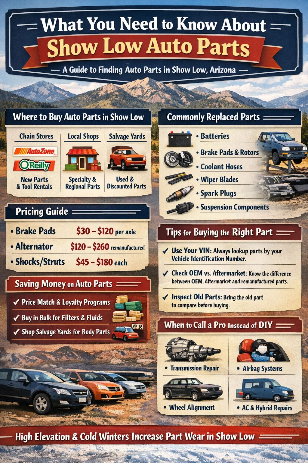 Show Low se află în județul Navajo la o altitudine de aproximativ 6.300 de picioare, iar climatul montan impune cerințe specifice de uzură asupra vehiculelor pe care șoferii din Phoenix sau Tucson pur și simplu nu le înfruntă. Pornirile la rece, sarea din drum în timpul furtunilor de iarnă și expunerea la UV la altitudine mare accelerează degradarea părților , în special pentru componente de cauciuc, baterii și sisteme de frânare. Aceasta înseamnă că locuitorii de aici înlocuiesc anumite piese de automobile mai frecvent decât media națională.