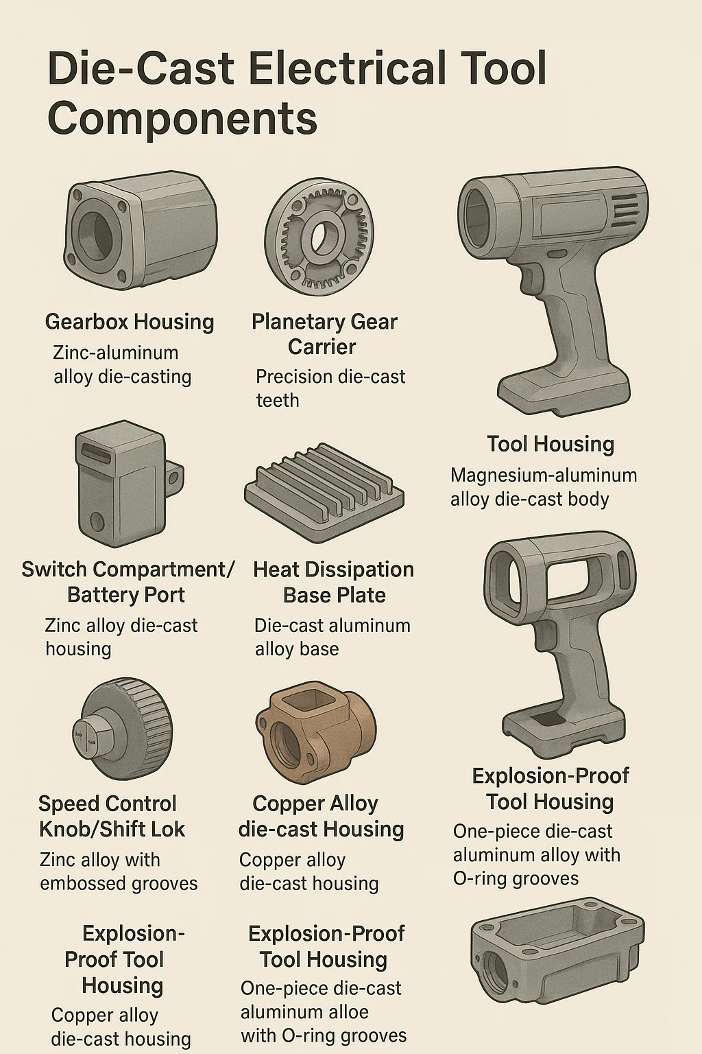 Componentele sculelor electrice turnate sub presiune se referă la piesele metalice de bază fabricate printr-un proces de turnare la presiune înaltă. Acestea abordează punctele cheie de durere ale instrumentelor electrice, cum ar fi impactul ridicat, disiparea căldurii și siguranța electrică. Aplicațiile și caracteristicile cheie sunt următoarele: