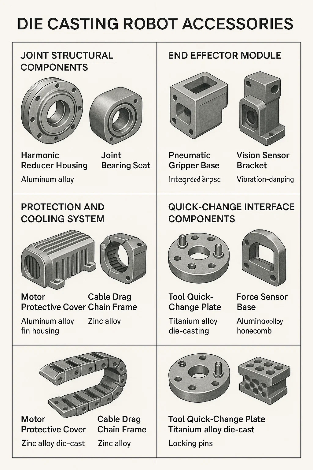 Accesorii robot de turnare sunt componente metalice de bază fabricate printr-un proces de turnare de înaltă presiune. Acestea abordează cerințele de bază ale roboților industriali, inclusiv precizie, ușoară și durabilitate. Aplicațiile și caracteristicile cheie sunt următoarele: