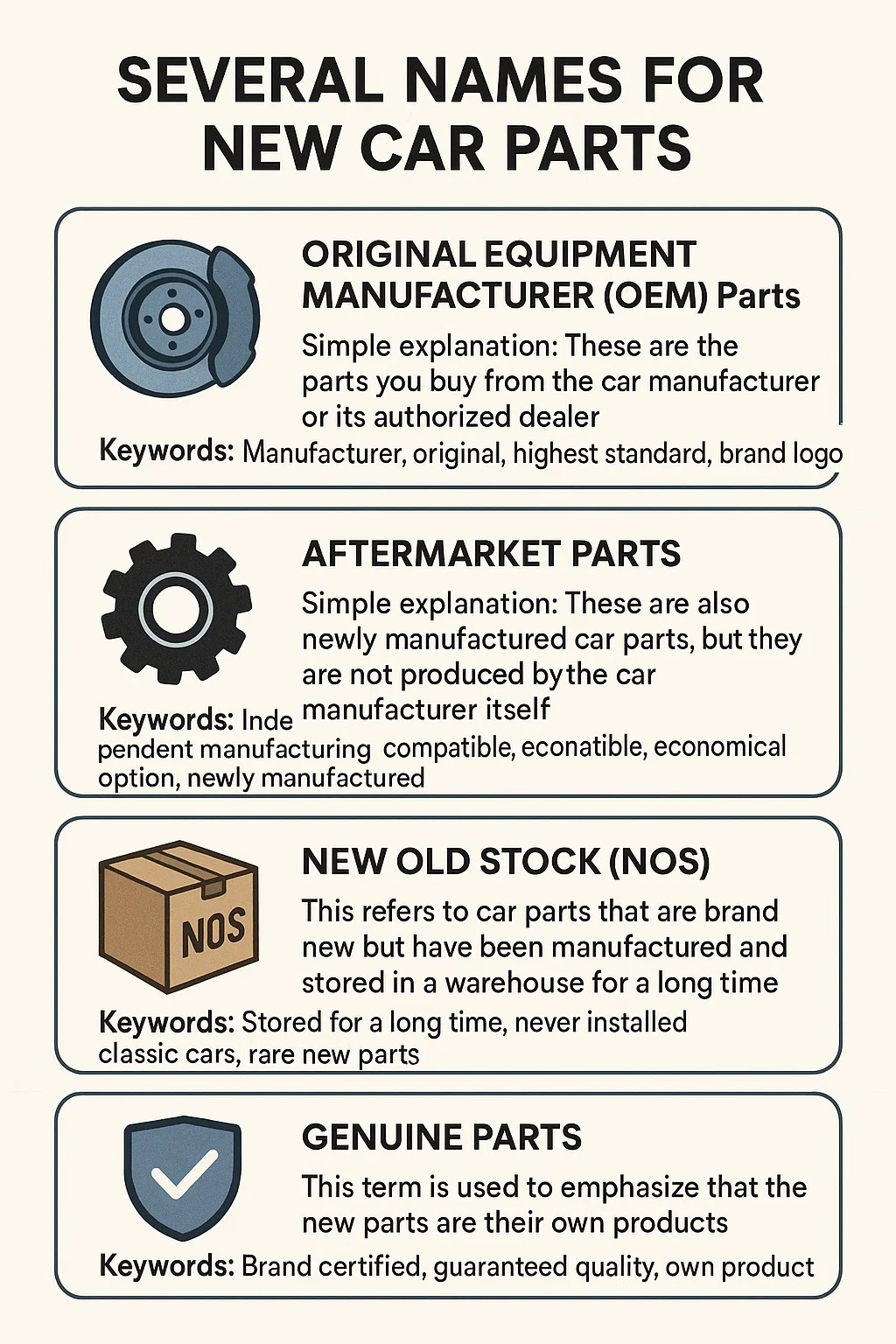 Explicație simplă: Acestea sunt și piese auto nou produse, dar nu sunt produse de producătorul auto în sine, ci de companii independente de piese. Vă puteți gândi la ele ca fiind piese noi „generice” sau „compatibile”. Sunt compatibile funcțional cu piesele OEM, dar pot diferi ușor în aspect sau materiale. Ele sunt de obicei o opțiune mai economică pe piața de piese noi.