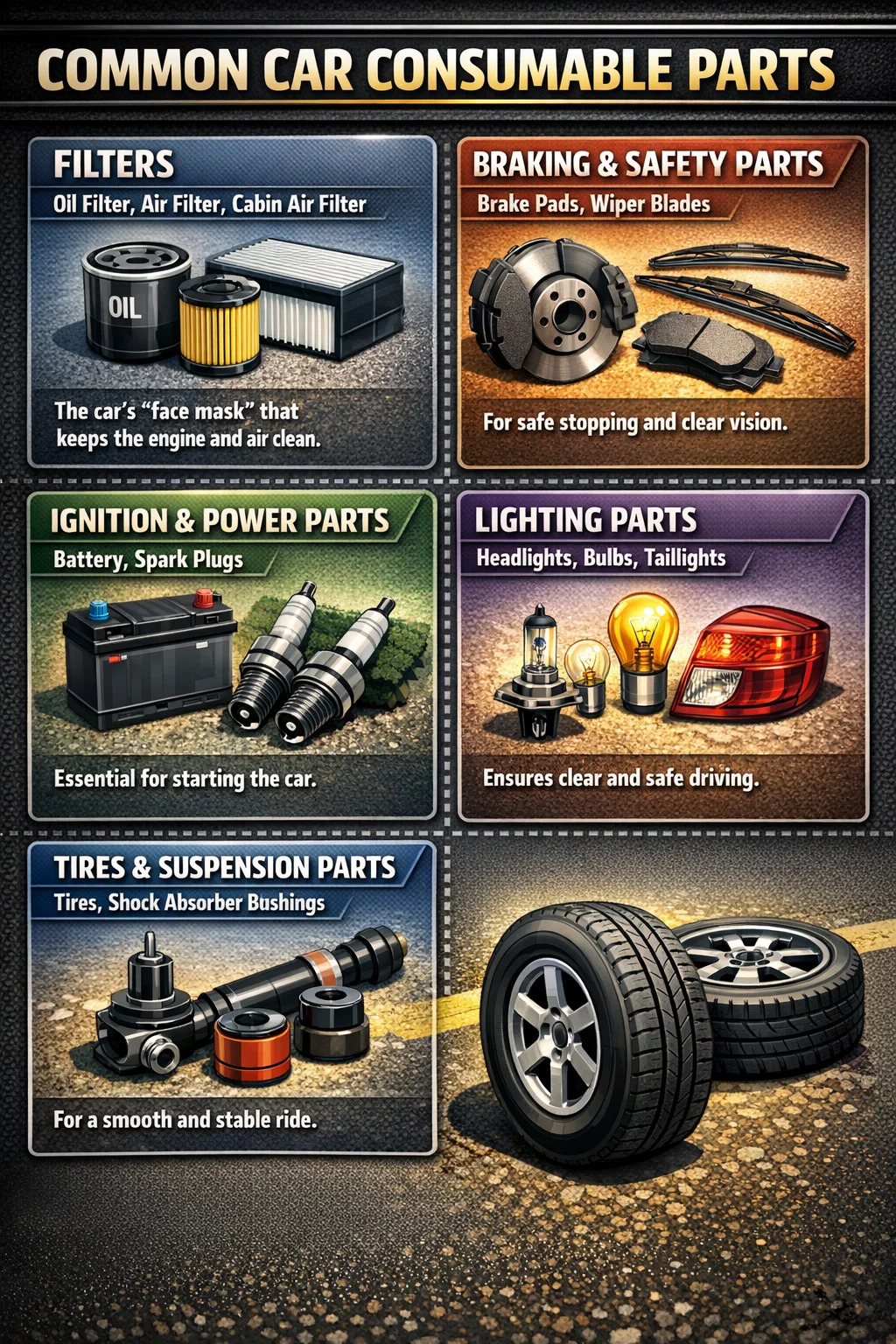 În lumea automobilelor, unele piese se uzează rapid și sunt la mare căutare, făcându-le ușor disponibile la orice magazin de piese auto sau atelier de reparații. Aceste piese auto sunt denumite în mod obișnuit „piese consumabile” sau „piese utilizate în mod obișnuit”.