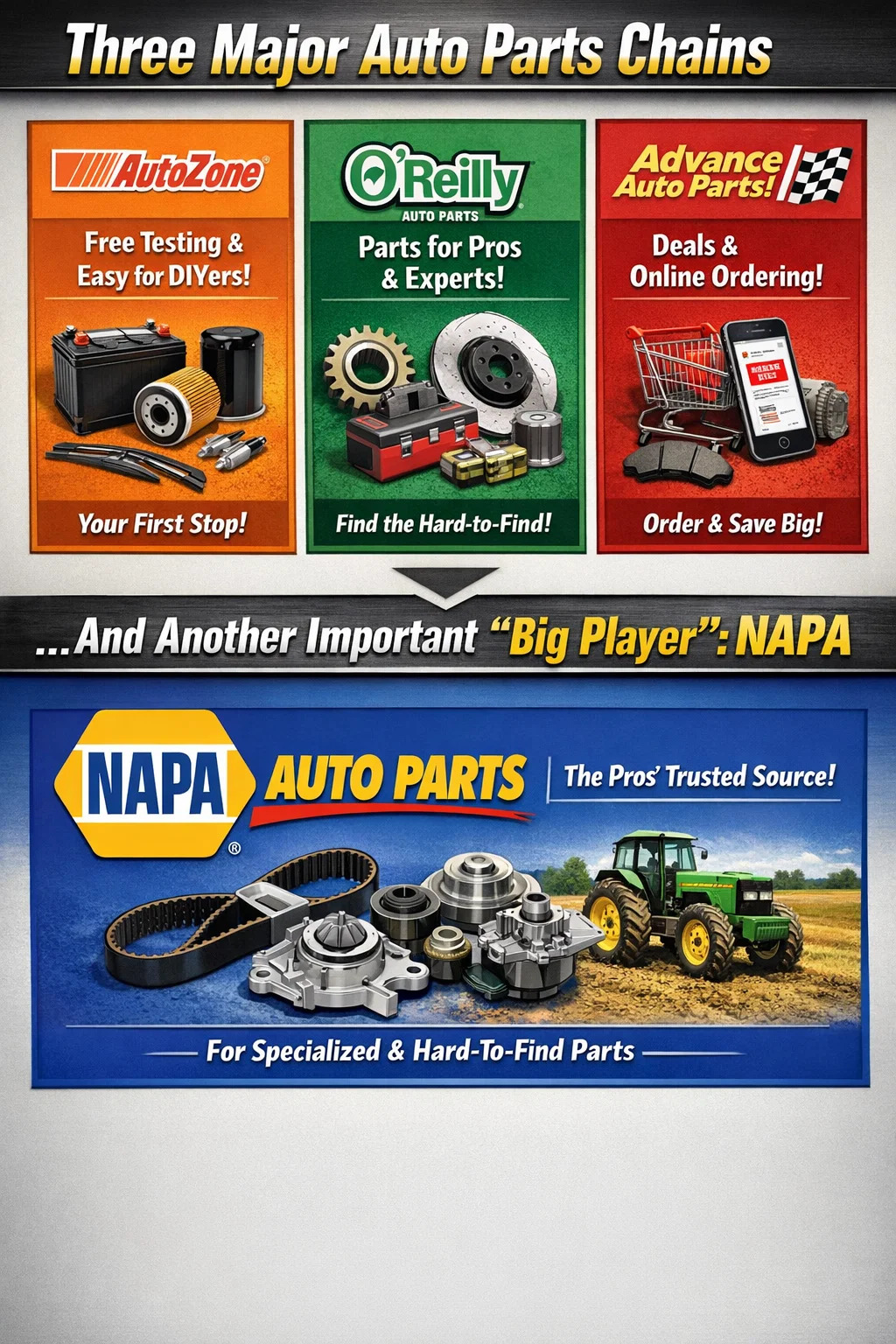 Deși cele trei menționate mai sus sunt adesea denumite „cei trei mari”, NAPA Auto Parts este, de asemenea, o prezență extrem de importantă. Deservește în primul rând tehnicieni profesioniști de reparații și piața mașinilor agricole. Dacă nu puteți găsi o piesă auto special specializată la „trei mari”, NAPA este adesea ultima speranță.